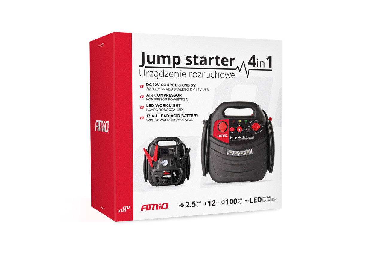 AMiO Jump Starter 12V 17Ah 900A 4in1 – Multifunctioneel Auto Accu Starter, Powerbank en Compressor JS01 Noodsituatie