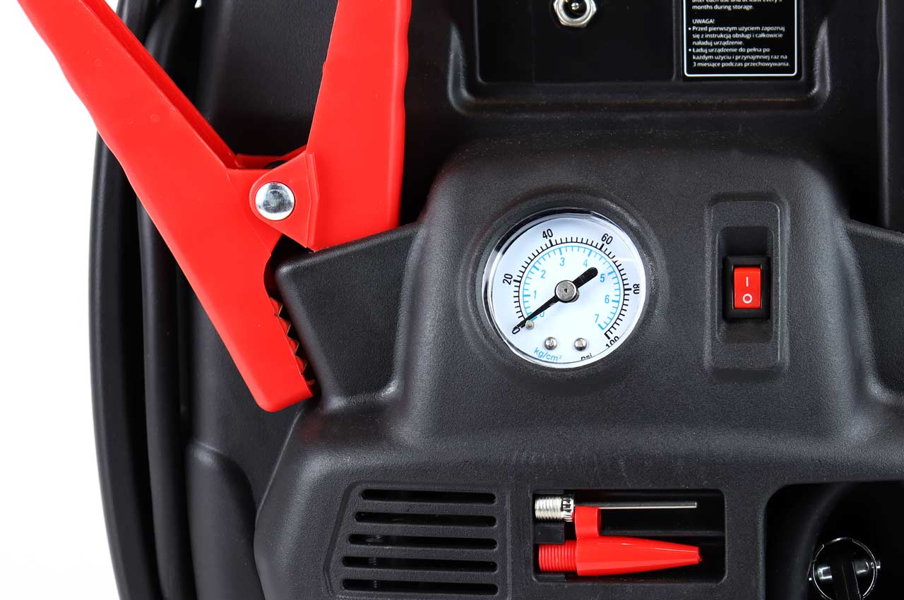 • Ingebouwde luchtcompressor Blaast banden op tot 7 BAR, handig voor auto, fiets of sportartikelen.