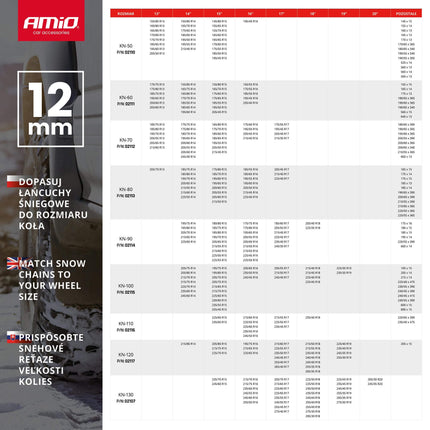 AMiO sneeuwkettingen KN120 zijn ontworpen voor voertuigen tot 1800 kg en bieden uitstekende grip op besneeuwde en ijzige oppervlakken. Gemaakt van gehard staal met een schakelhoogte van 12 mm, zijn ze ideaal voor voertuigen die extra grip nodig hebben onder winterse omstandigheden.