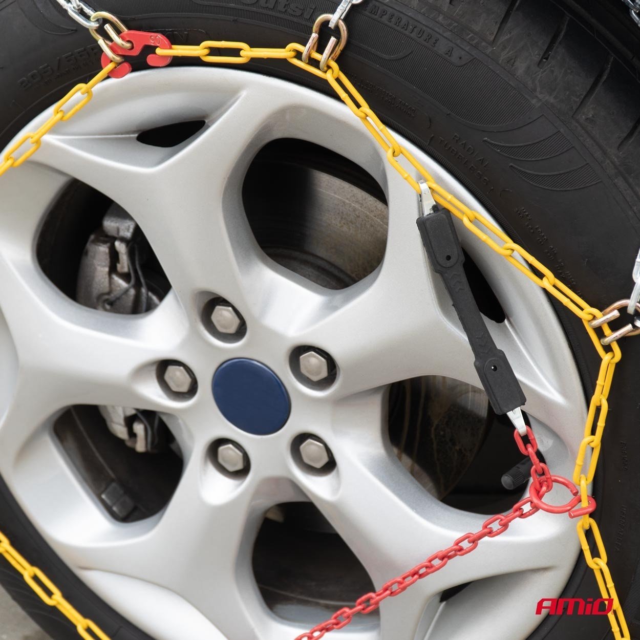 AMiO sneeuwkettingen KN130 zijn ideaal voor voertuigen tot 1800 kg en bieden uitstekende grip op besneeuwde en ijzige wegen. De kettingen zijn gemaakt van gehard staal met een asymmetrisch diamantvormig kettingpatroon, wat de grip van het wiel verbetert. De sterke schakels van 12 mm hoogte en het vierkante dwarsprofiel bieden een duurzame oplossing voor winterse rijomstandigheden.
