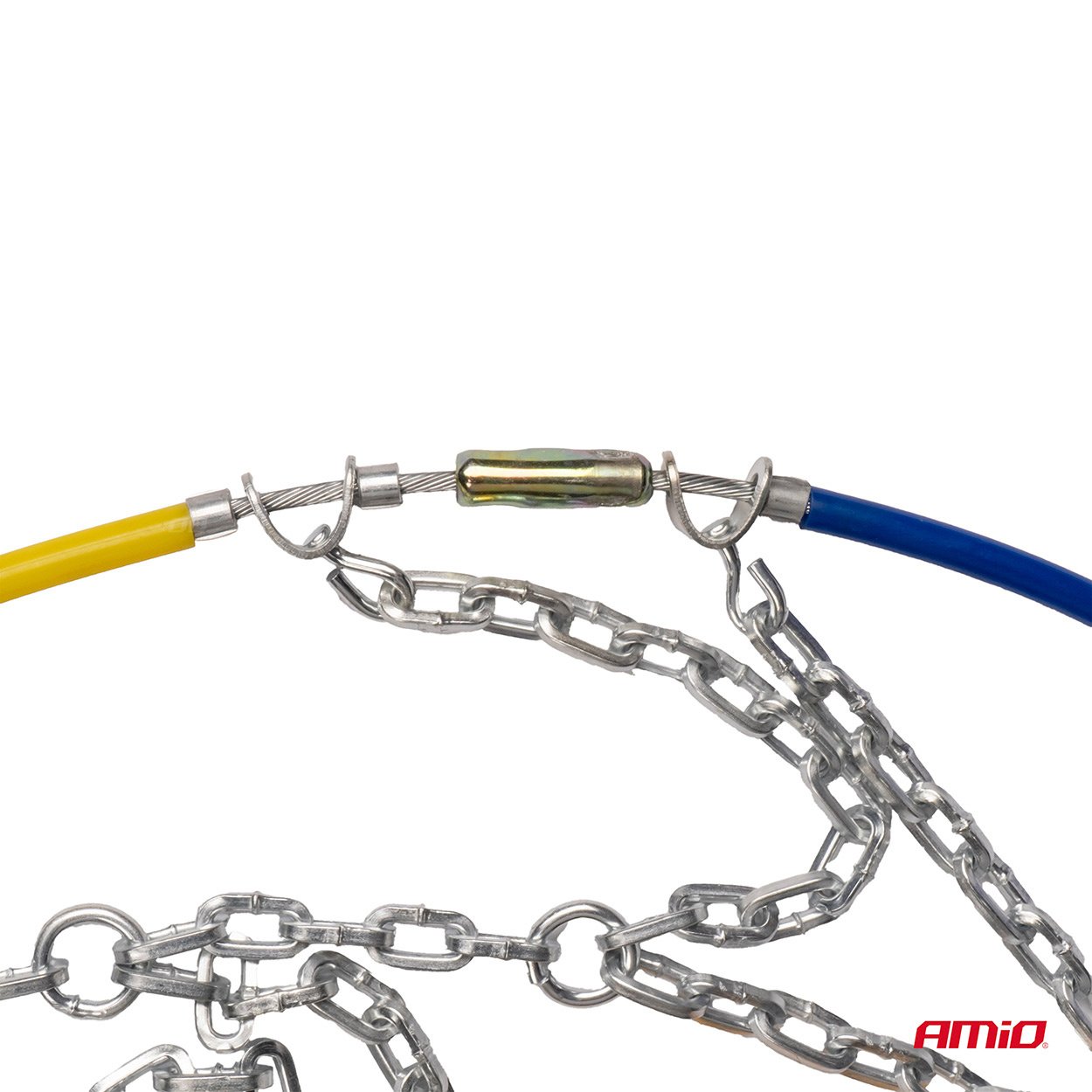 AMiO sneeuwkettingen KN80 zijn ontworpen voor voertuigen tot 1800 kg en bieden uitstekende grip op besneeuwde en ijzige wegen. Gemaakt van gehard staal, met een schakelhoogte van 12 mm, zijn deze kettingen ideaal voor het verbeteren van de grip en veiligheid tijdens winterse rijomstandigheden.