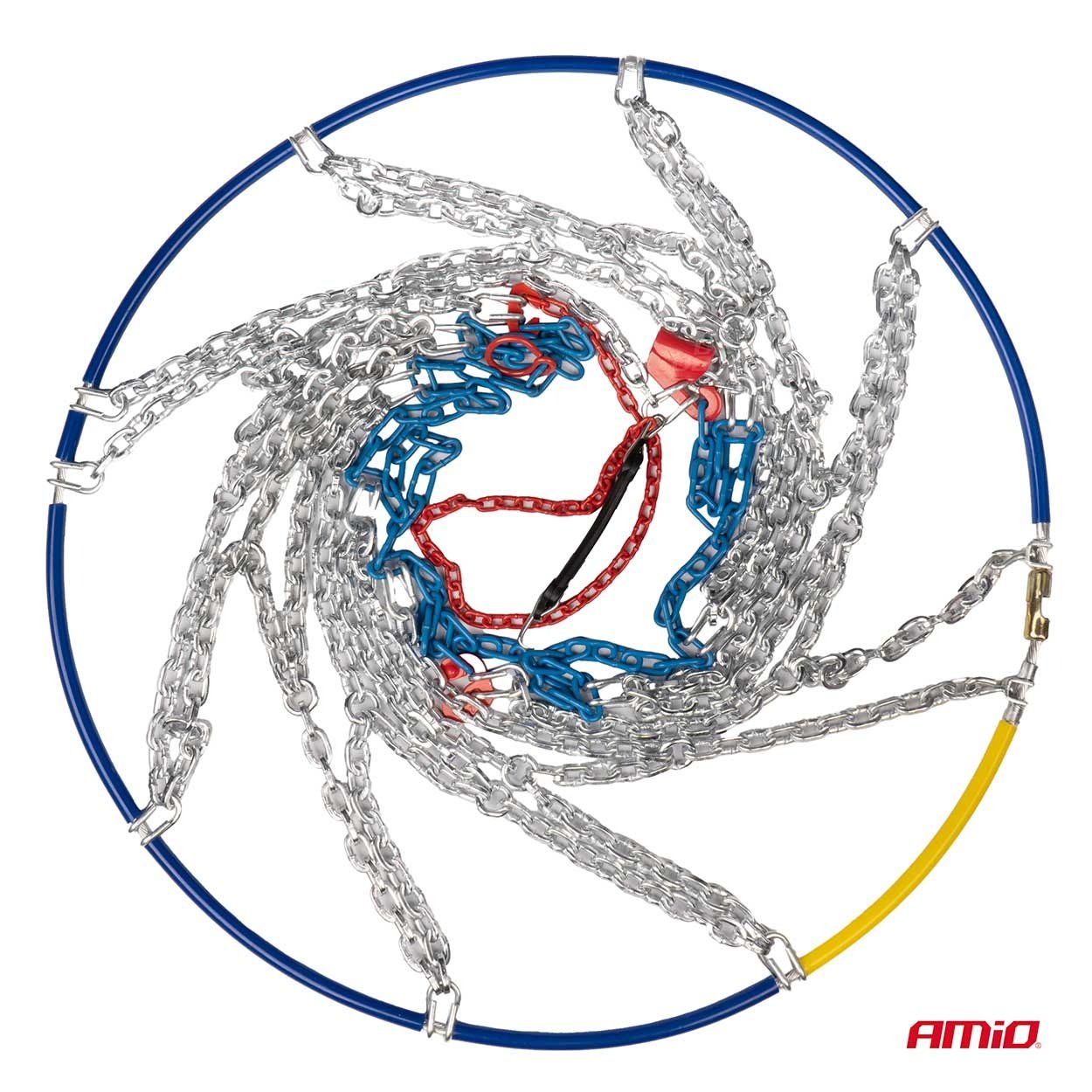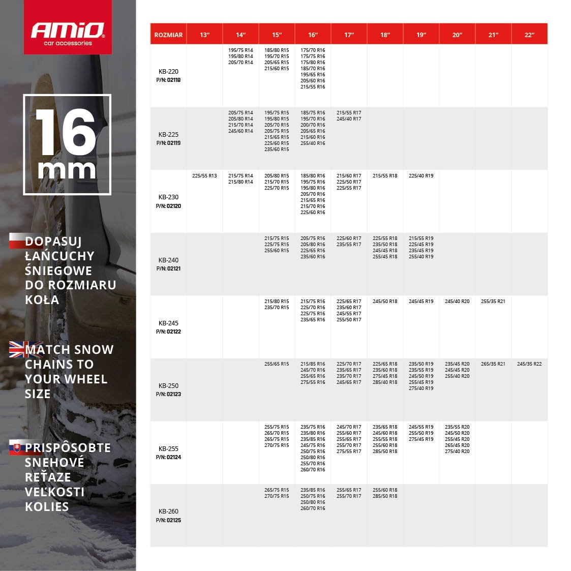 AMiO sneeuwkettingen KB220 zijn ontworpen voor voertuigen tot 7500 kg en bieden uitstekende grip en stabiliteit op besneeuwde en ijzige wegen. Deze kettingen zijn gemaakt van gehard staal en hebben een schakelhoogte van 16 mm, wat zorgt voor duurzaamheid en optimale tractie. Ze zijn compatibel met ABS en ESPsystemen, wat extra veiligheid biedt tijdens het rijden.