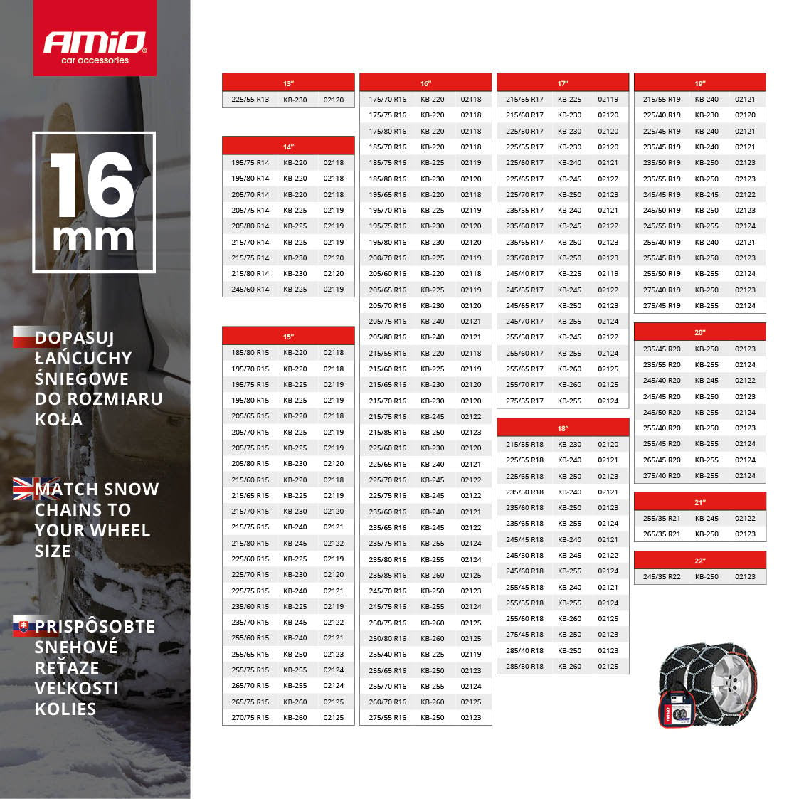 AMiO sneeuwkettingen KB230 zijn ontworpen voor voertuigen tot 7500 kg en bieden uitstekende prestaties op besneeuwde en ijzige wegen. De kettingen zijn gemaakt van gehard staal en hebben een schakelhoogte van 16 mm, wat zorgt voor een stevige grip en duurzaamheid. Ze zijn compatibel met ABS en ESPsystemen, wat de veiligheid en stabiliteit tijdens het rijden bevordert.