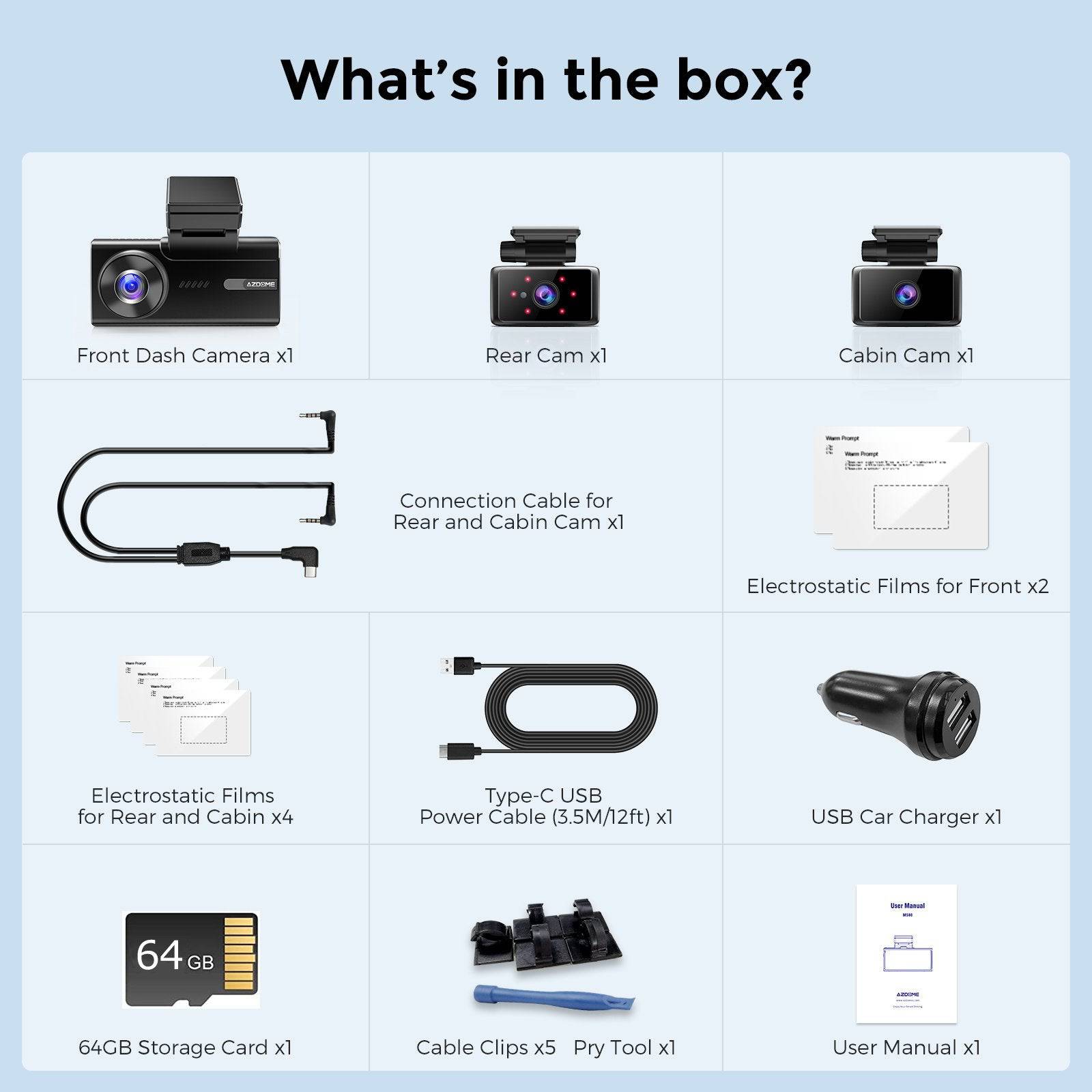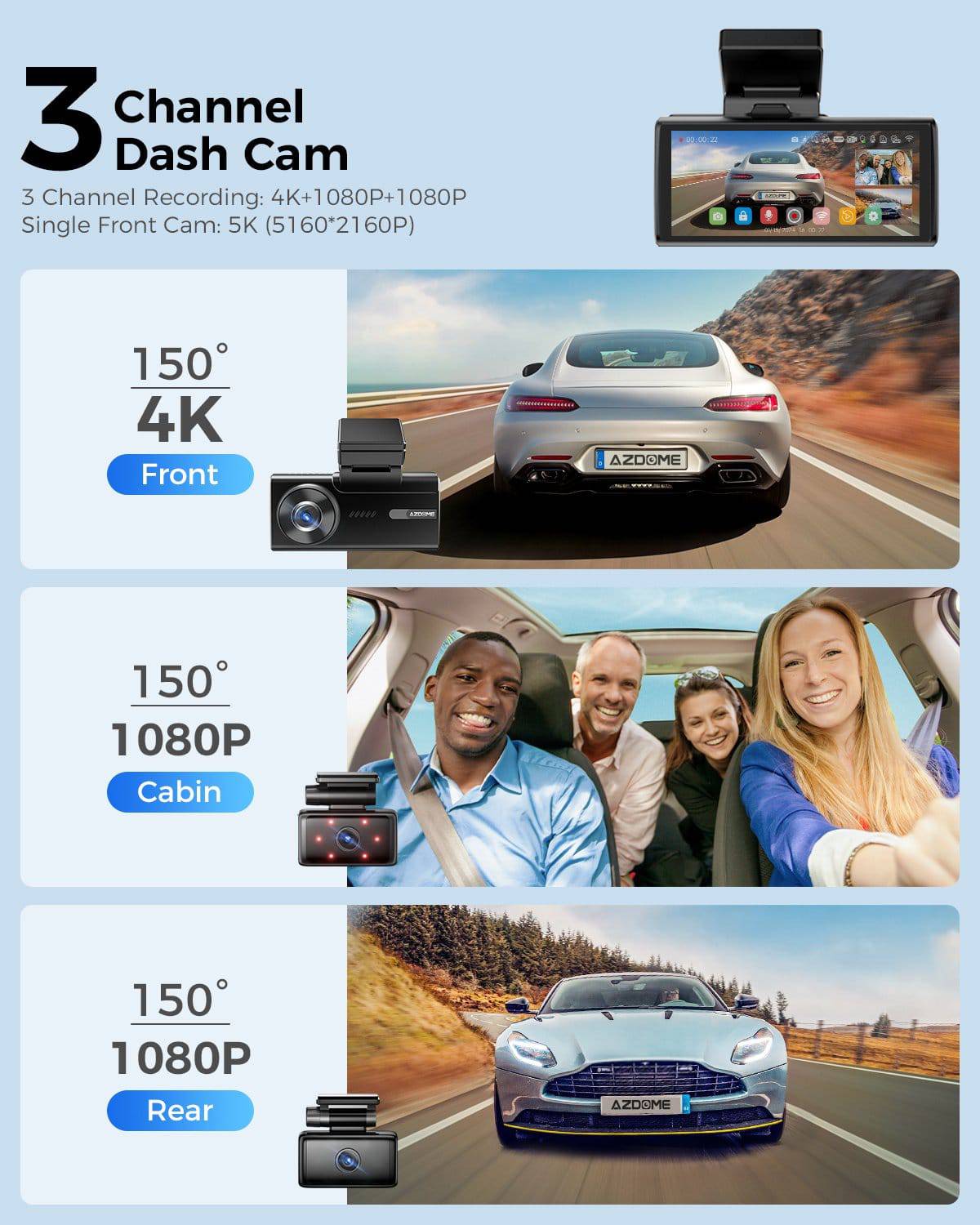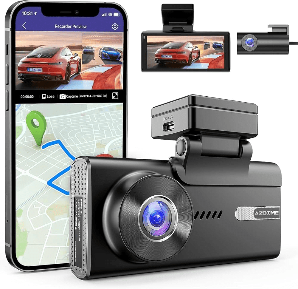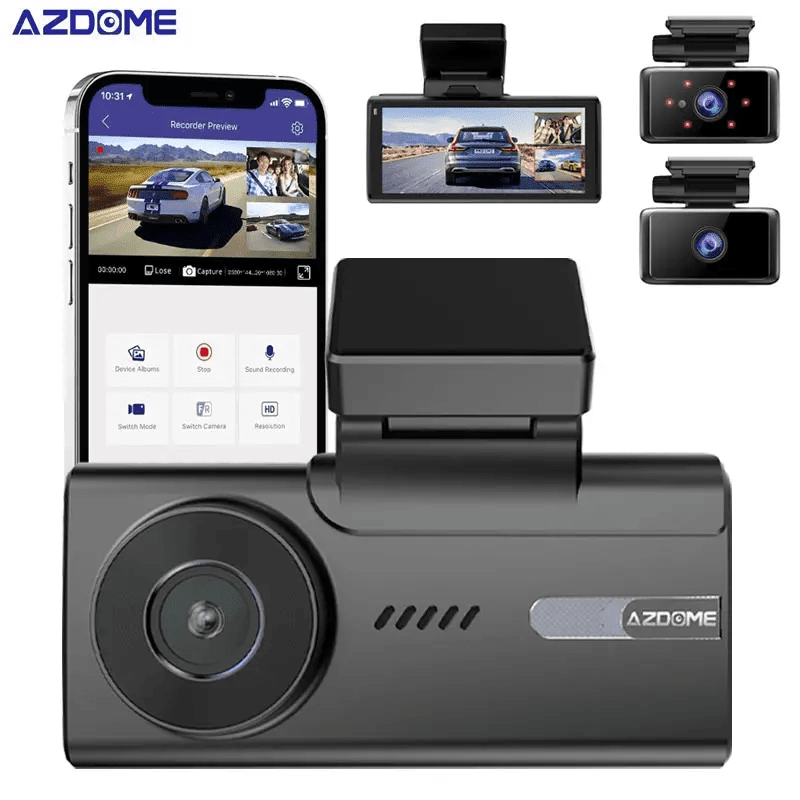 Verhoog je veiligheid op de weg met de Azdome M580 videorecorder. Deze geavanceerde dashcamset bestaat uit een frontcamera met een resolutie tot 5K, een achtercamera en een interne camera, wat zorgt voor uitgebreide dekking van de omgeving van je voertuig. Met ingebouwde GPS en Gsensortechnologie biedt hij functies zoals lusopname en timelapseopname.