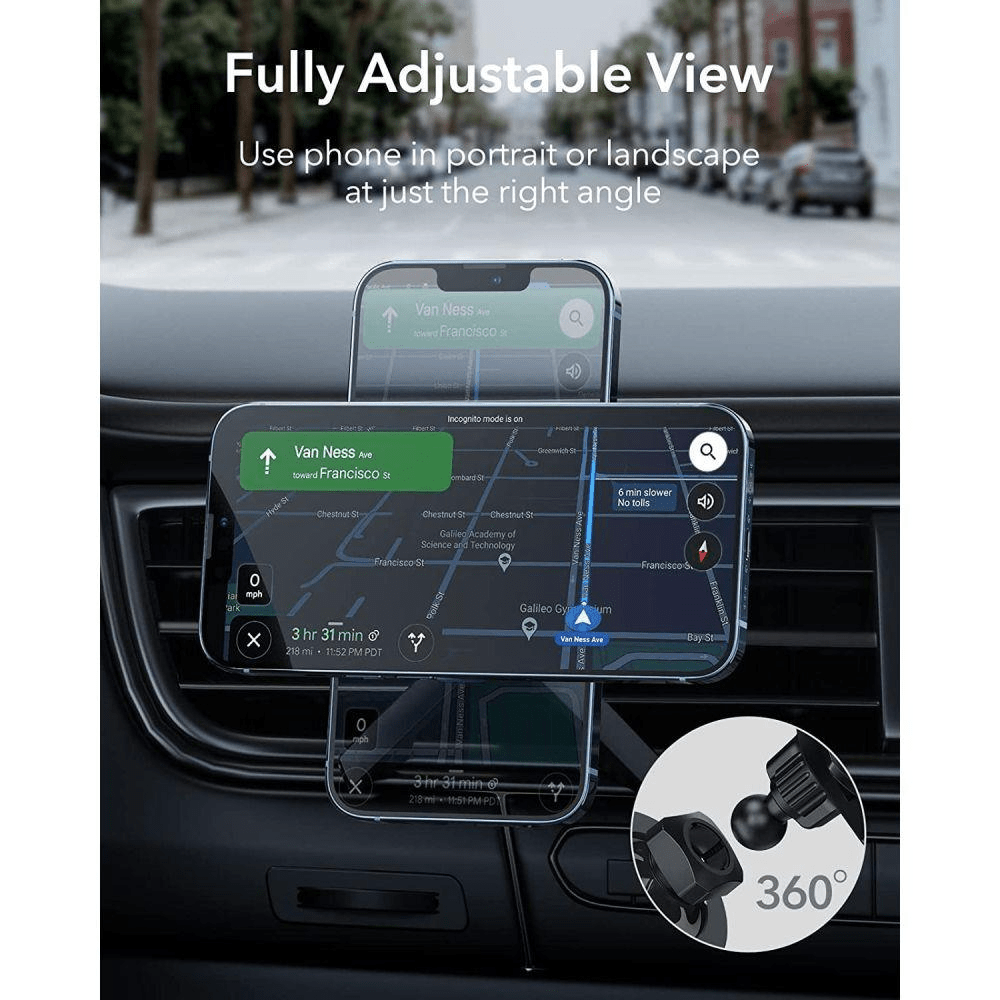 Deze ESR telefoonhouder plaats je in het ventilatierooster van je auto zodat je veilig je navigatie kunt aflezen of je telefoon handsfree kunt gebruiken voor het afspelen van muziek. De houder heeft ingebouwde magneten waardoor jij je iPhone met MagSafe (vanaf iPhone 12modellen en nieuwer) magnetisch op de houder plaatst. Dit kan in zowel verticale als horizontale positie zodat je comfortabel je navigatie kan aflezen. Je oplaadkabel kun je kwijt in de kabelclip. Hierdoor heb je geen last meer van rondslingerende kabels.
