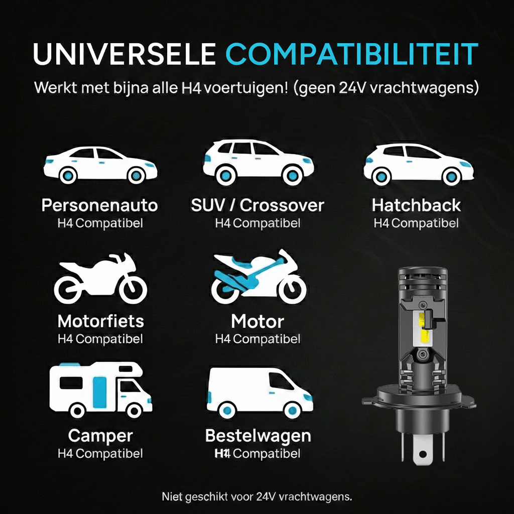 Deze set is perfect voor wie maximale zichtbaarheid en veiligheid wil zonder ingewikkelde montage. Ideaal voor zowel dimlicht als grootlicht, en geschikt voor vrijwel elk voertuig met H4-fitting.