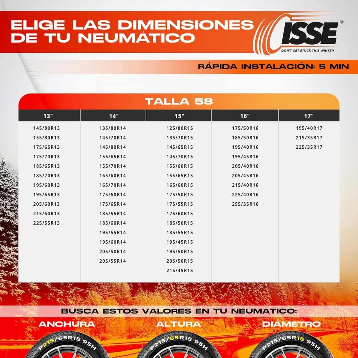 De Isse Super textiele sneeuwkettingen in Sformaat zijn de perfecte oplossing voor voertuigen met bandenmaat 58. Deze sneeuwkettingen verbeteren de grip op besneeuwde en ijzige wegen, waardoor je veilig kunt rijden in winterse omstandigheden. Dankzij het flexibele en lichtgewicht ontwerp zijn ze eenvoudig aan te brengen en te verwijderen. De witte en oranje kleuren zorgen voor een uitstekende zichtbaarheid, zelfs in donkere of stormachtige weersomstandigheden. De set bevat twee kettingen die snel en effectief extra grip bieden.