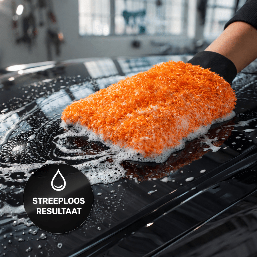 Zodra je de oranje vezels aanraakt, voel je de fluweelzachte textuur die specifiek is ontwikkeld voor gevoelige autolakken. De mitt glijdt soepel over de carrosserie, waarbij je de controle behoudt over elke curve van de auto. Het resultaat is een zichtbaar diepere glans die je auto weer die 'showroom look' geeft.